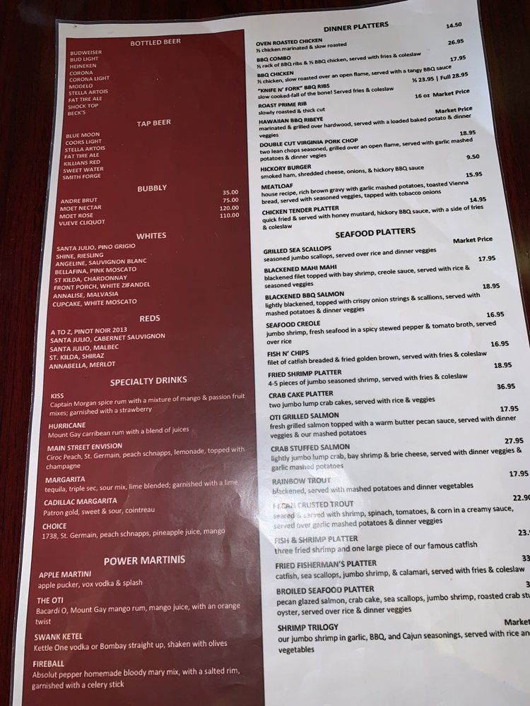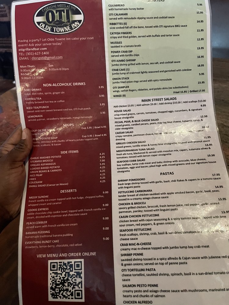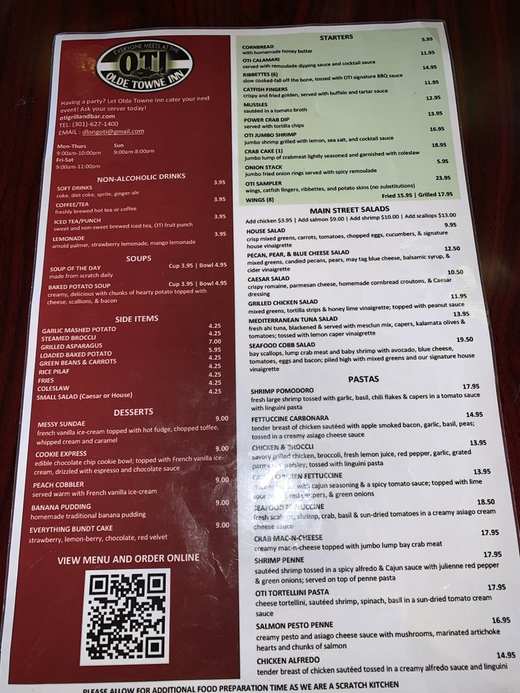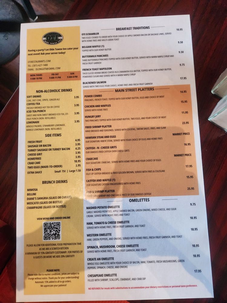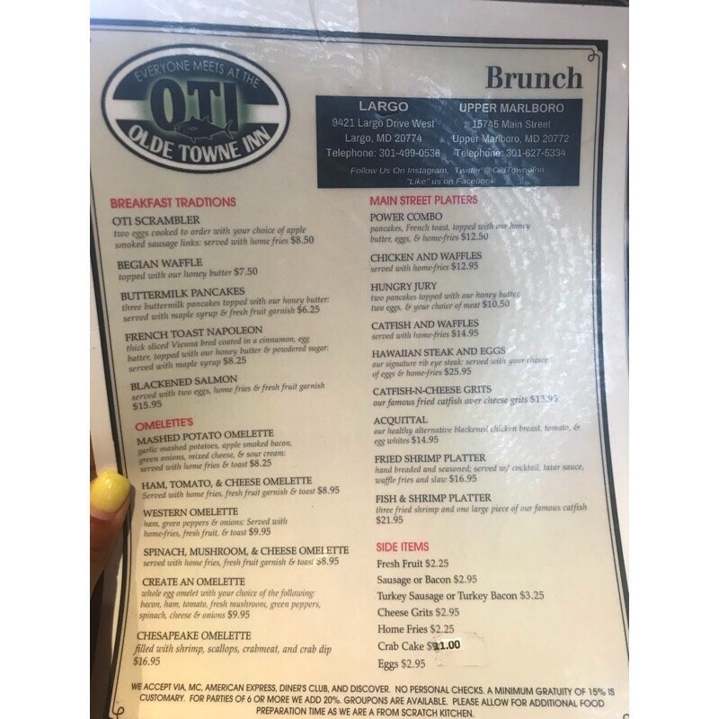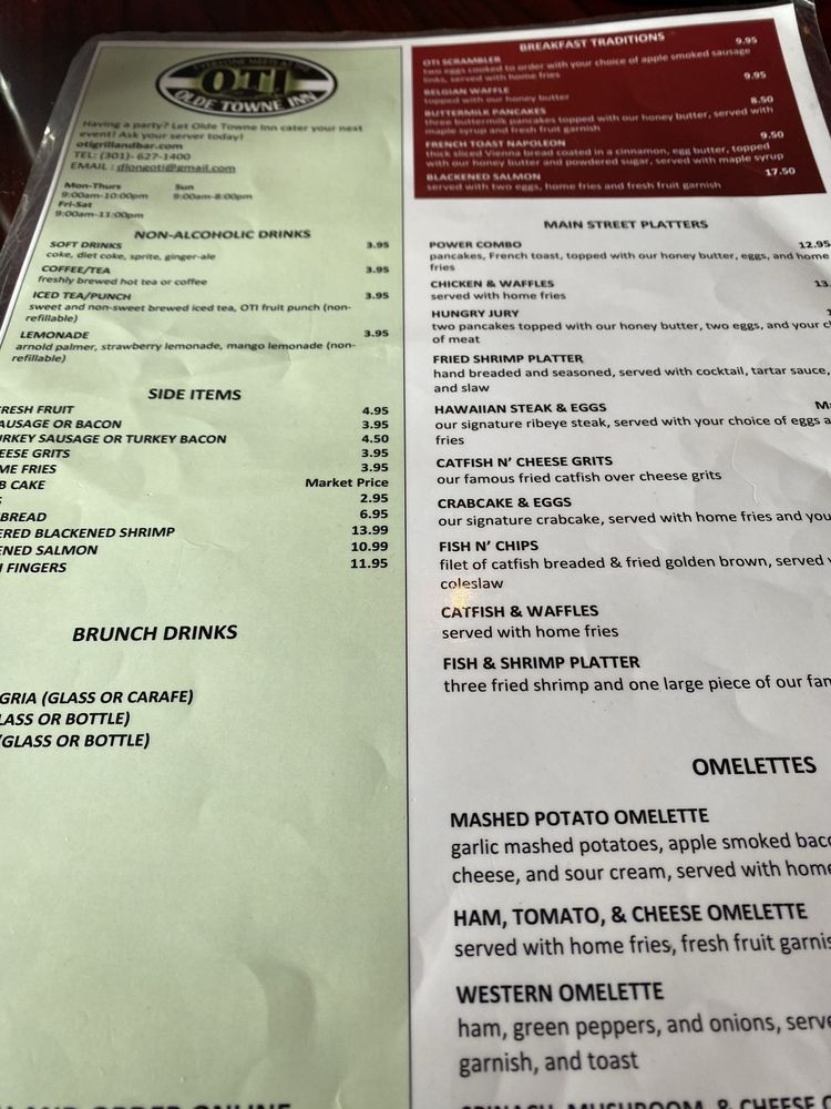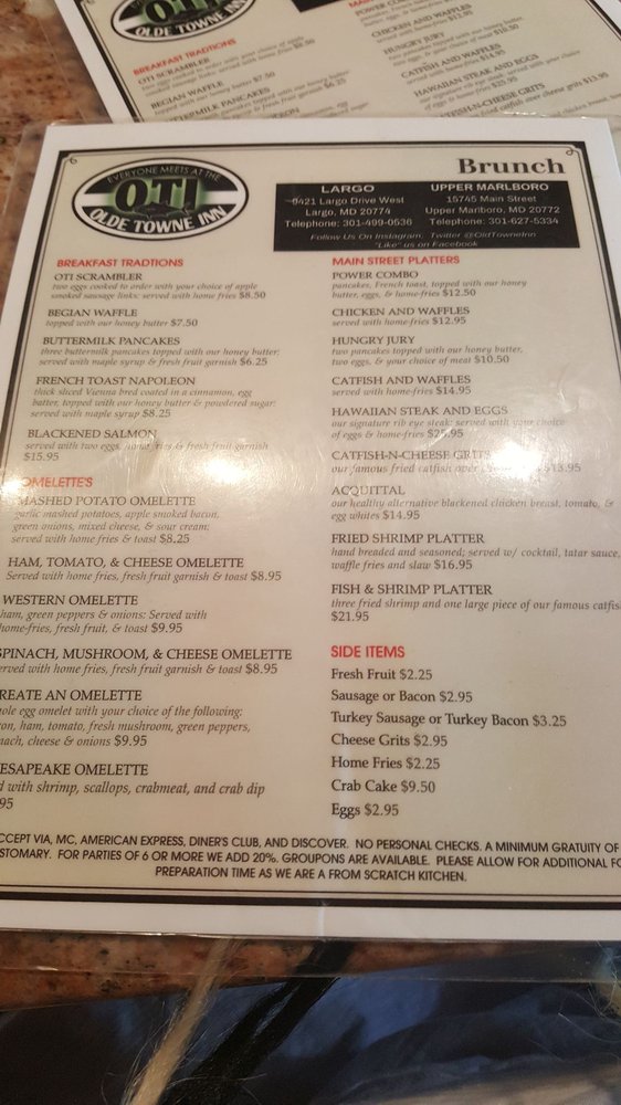 Introducing Olde Towne Inn, a New American Seafood restaurant located at 14745 Main St in Upper Marlboro, MD. This restaurant offers a variety of options for breakfast and brunch, including the Olde Towne Inn Scrambler, Belgian Waffle, and Buttermilk Pancakes. The brunch menu features delicious omelettes such as the Mashed Potato Omelette and Spinach Mushroom and Cheese Omelette. For the main course, the Main Street Platter offers choices like Chicken and Waffles, Catfish and Waffles, and Hawaiian Steak and Eggs. With numerous amenities such as wheelchair accessibility, outdoor seating, and a full bar, Olde Towne Inn is the perfect spot for a casual dining experience. Don't miss out on the happy hour specials and vegetarian options that this restaurant has to offer. Consider trying their signature dishes and enjoy a delightful meal in a friendly atmosphere.
